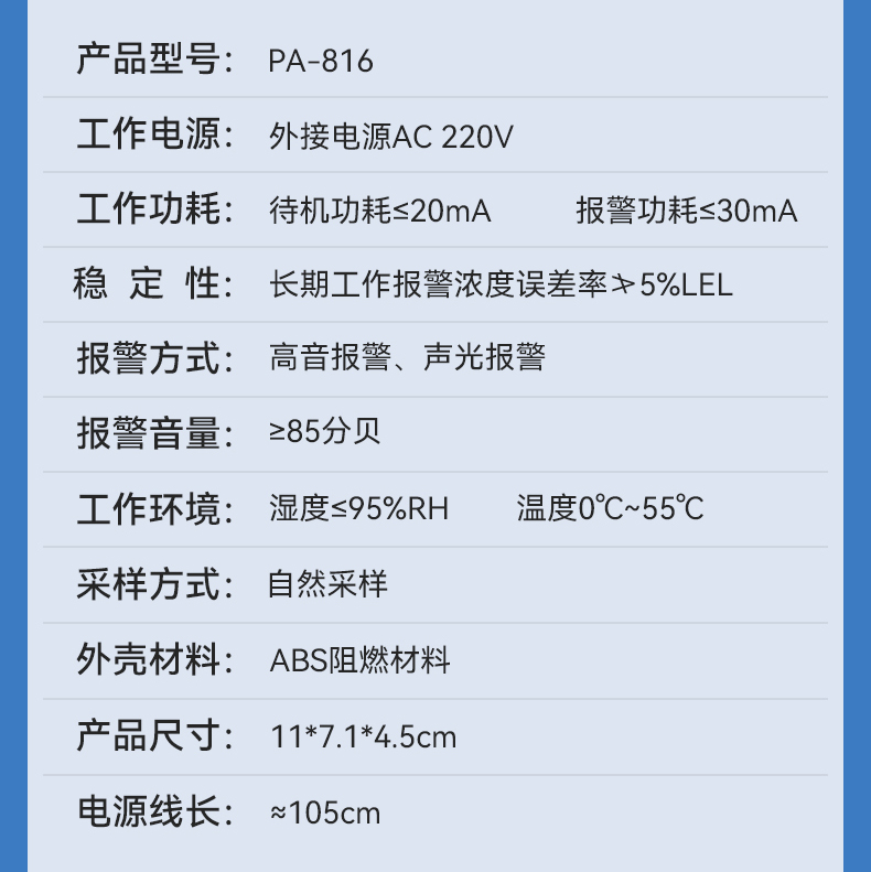 燃氣報警器 (型號PA-816) 產品規格 功能特點 資料下載 燃氣報警器 (型號PA-816)報警方式:高音報警、聲光報警工作電源:外接 電源AC220V故障自檢:泄露報警、正常工作、故障提醒多種氣體檢測平安保險85分貝高音量報警適用場景:適用于家庭廚房、酒店廚房、食堂、商場等場所
