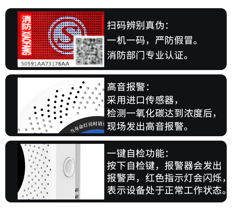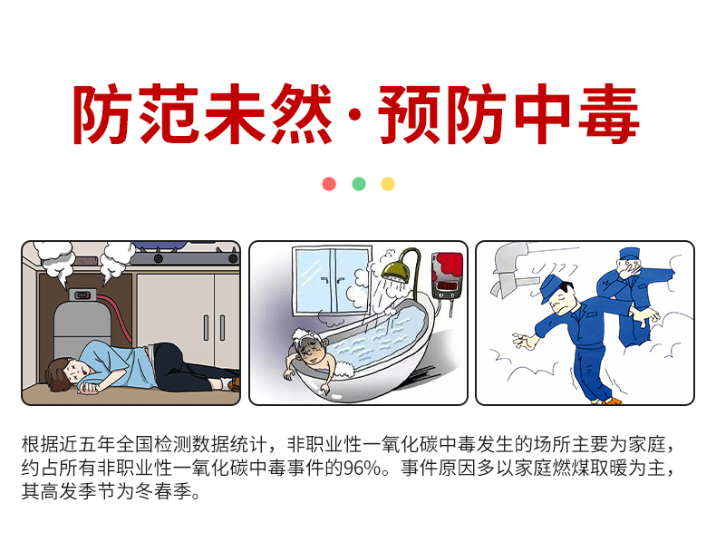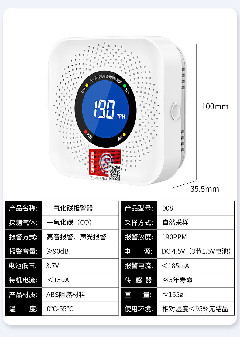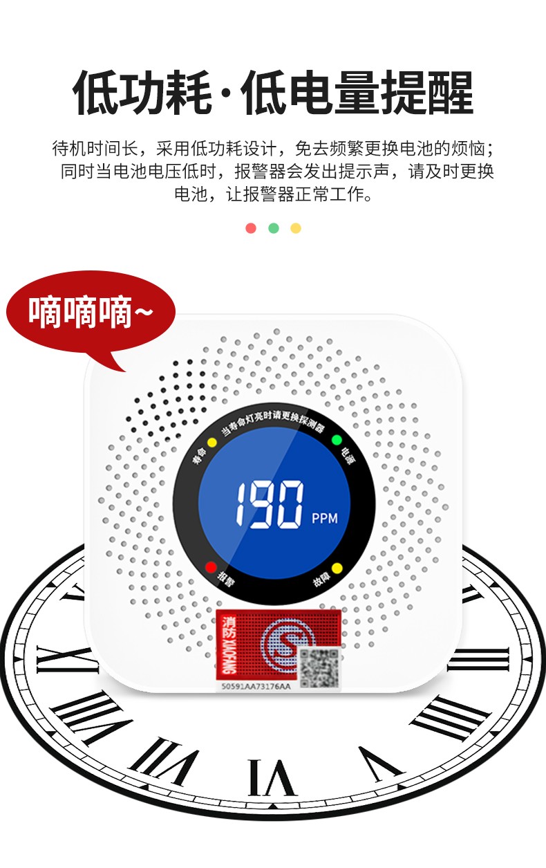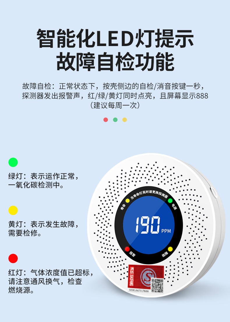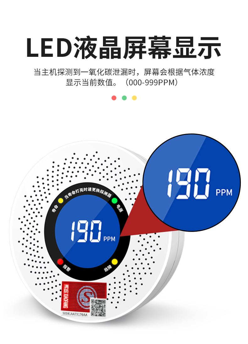 一氧化碳報警器(型號PA-008) 產(chǎn)品規(guī)格 功能特點 資料下載 一氧化碳報警器(型號PA-008)檢測氣體、燒煤、燒柴、燒炭、蜂窩媒、露營封閉環(huán)境、封閉車內(nèi)85分貝報警音量.LED液晶屏幕顯示故障自檢: 綠燈(正常)、黃燈 (故障、需要檢修) 紅燈(氣體濃度超標(biāo)) 5.報警方式:蜂鳴聲提示 6. 產(chǎn)品保險:1000萬承險 7. ABS阻燃材質(zhì)適用場景:適用于廚房、浴室、起居室、火鍋包廂、飯?zhí)玫乳L時間空氣不流通的場所安裝一氧化碳報警探測器