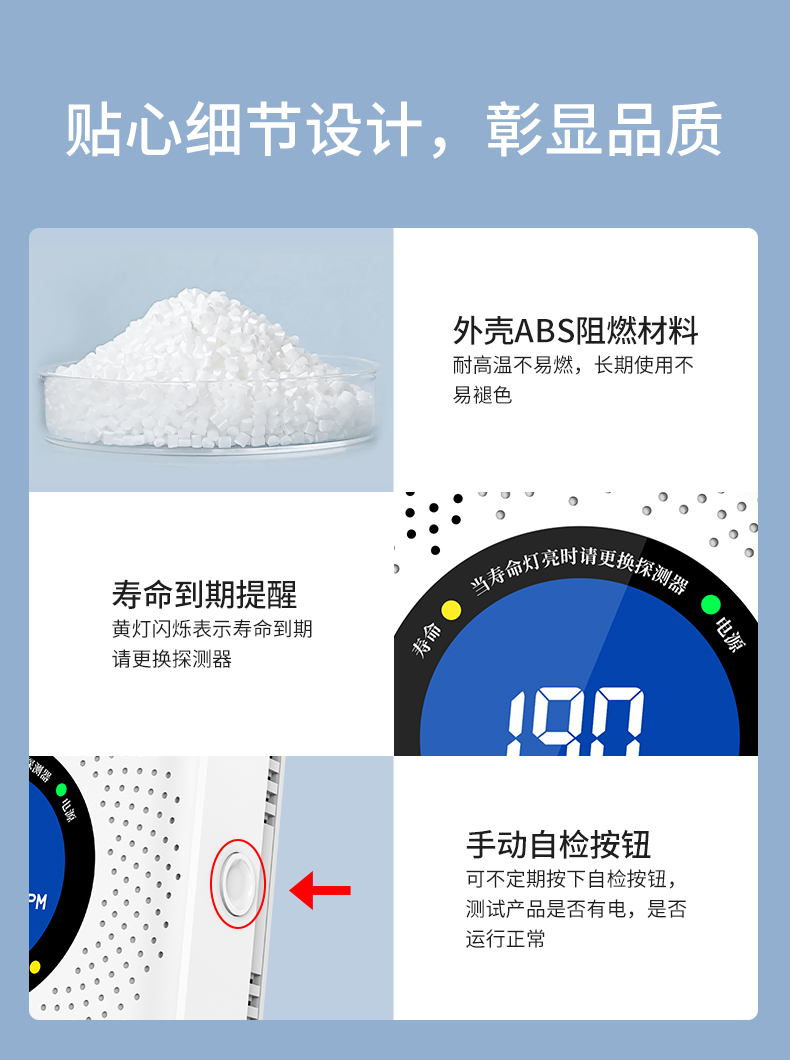 一氧化碳報警器(型號PA-009) 產(chǎn)品規(guī)格 功能特點(diǎn) 資料下載 一氧化碳報警器(型號PA-009)1.檢測氣體、燒煤、燒柴、燒炭、蜂窩媒、露營封閉環(huán)境、封閉車內(nèi)2.85分貝報警音量3..LED液晶屏幕顯示4.故障自檢: 綠燈(正常)、黃燈 (故障、需要檢修) 紅燈(氣體濃度超標(biāo))5.報警方式:蜂鳴聲提示 6. 產(chǎn)品保險:1000萬承險7. ABS阻燃材質(zhì)適用場景:適用于廚房、浴室、起居室、火鍋包廂、飯?zhí)玫乳L時間空氣不流通的場所安裝一氧化碳報警探測器