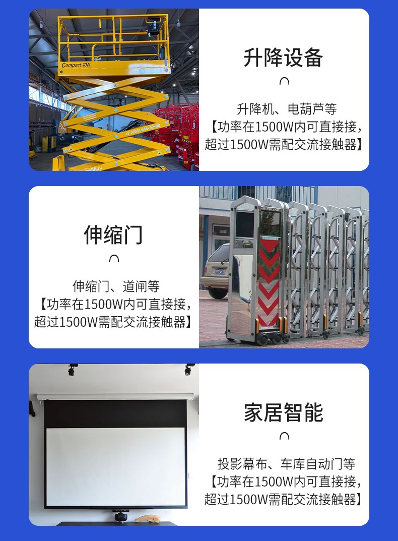應(yīng)用場(chǎng)景:起吊設(shè)備 ,大鵬卷簾機(jī)、升降設(shè)備、正反轉(zhuǎn)電機(jī),工業(yè)信號(hào)控制, 投影幕布等