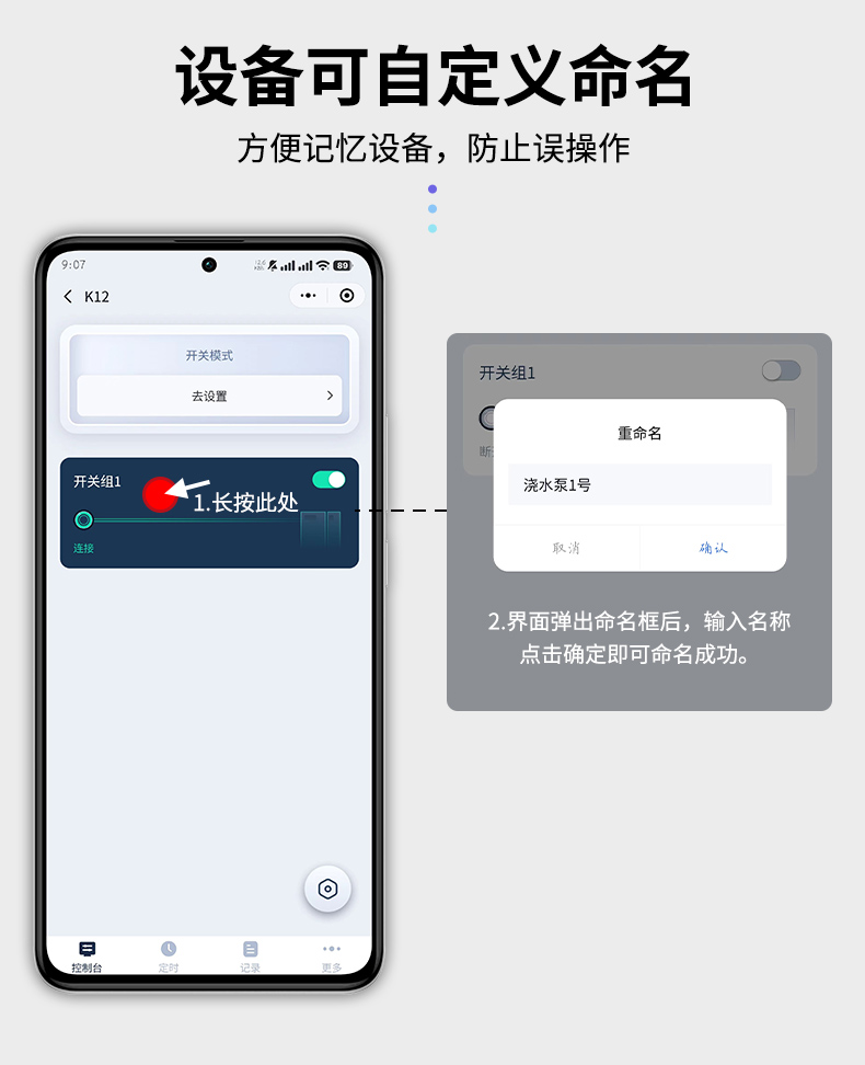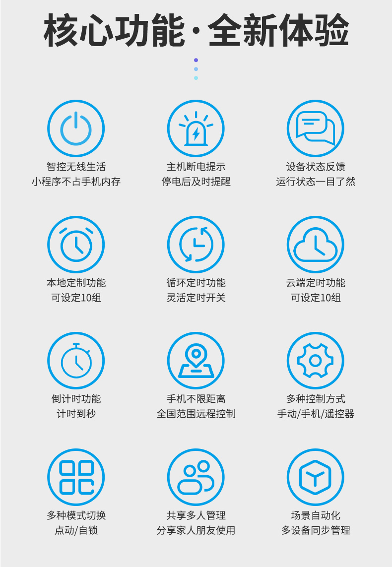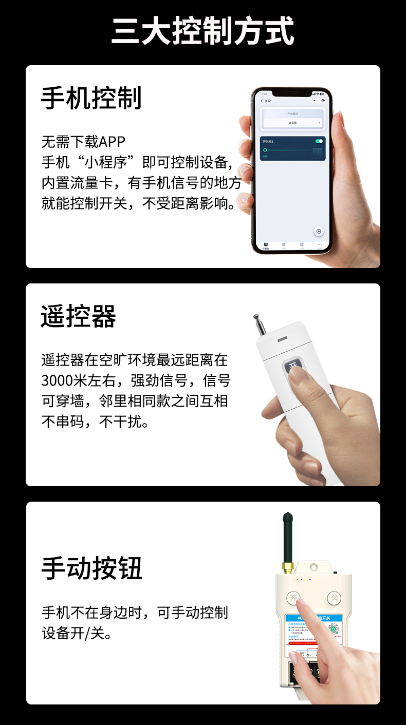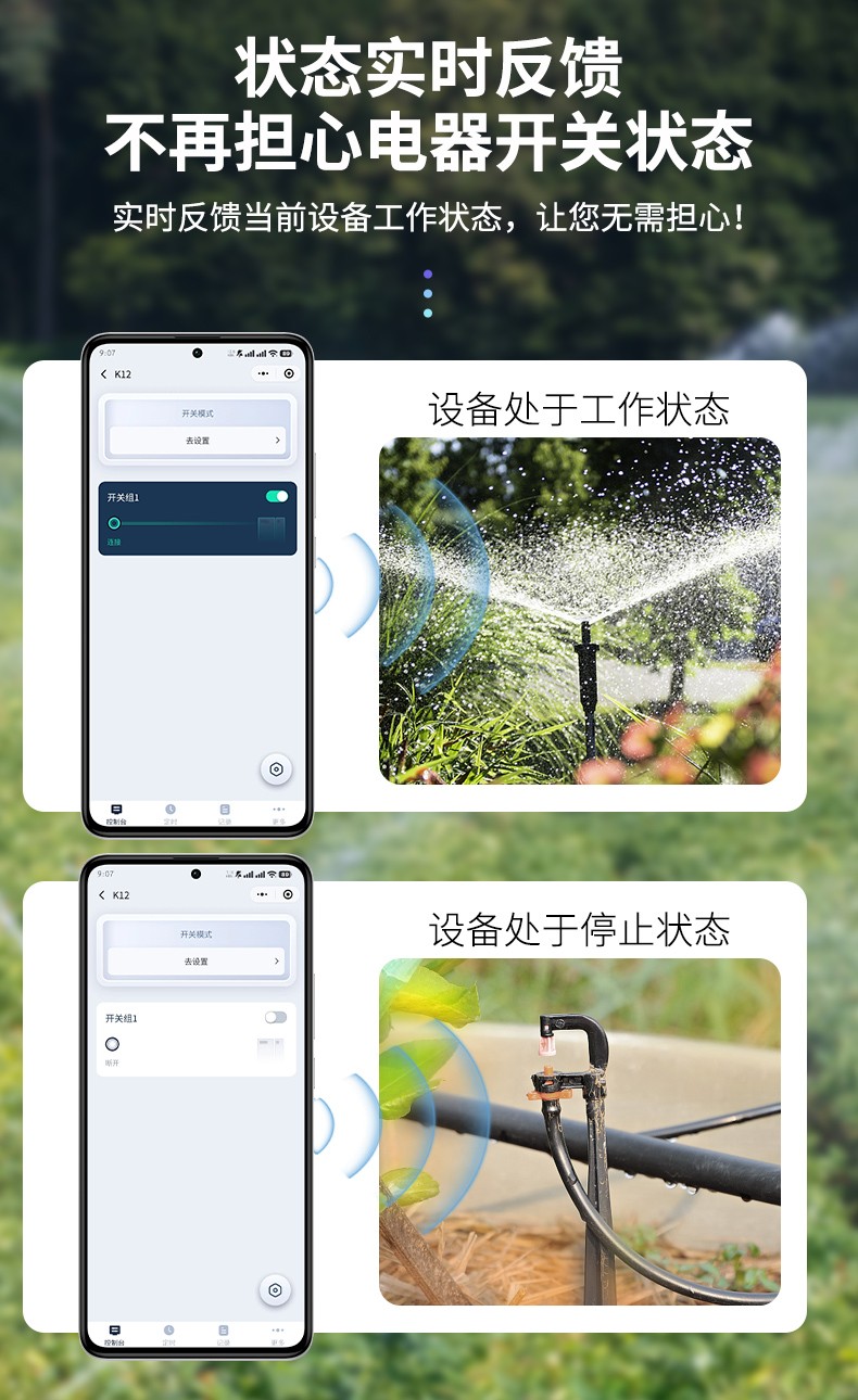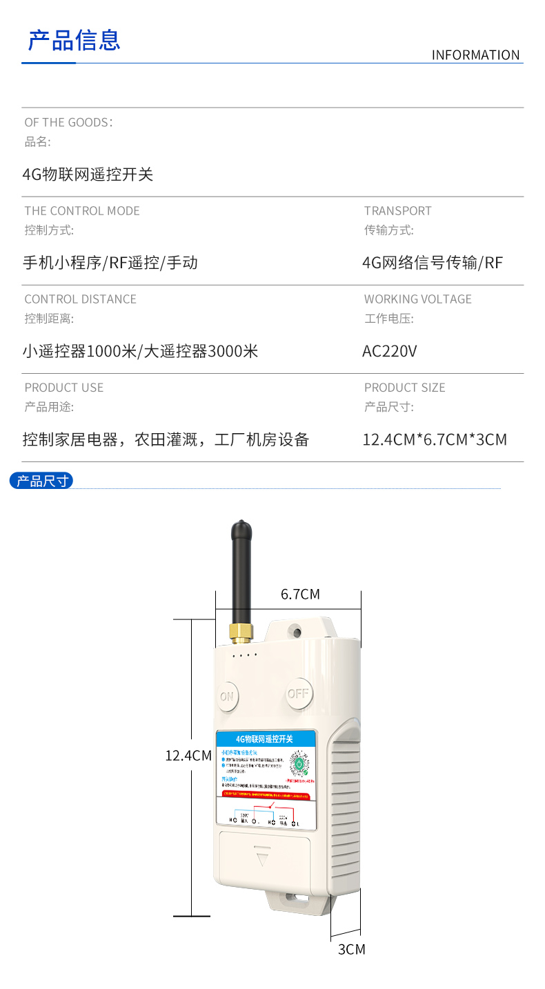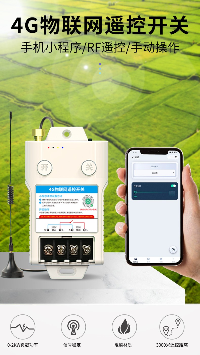 4G遠程控制開關(YS-K12) 產品規格 功能特點 資料下載 4G遠程控制開關(YS-K12)1.斷電報警、狀態檢測、多人管理 、場景自動化、設備狀態實時反饋2..云端定時:倒計時、本地定時、 循環定時3.控制方式:手動按鈕控制、 遙控器、 手機控制 4.多種模式切換:點動/自鎖4.控制距離: 手機不限制距離 、遙控器控制(空曠地3000米)5.應用場景: 家具電器、農田灌溉、工廠機房設備